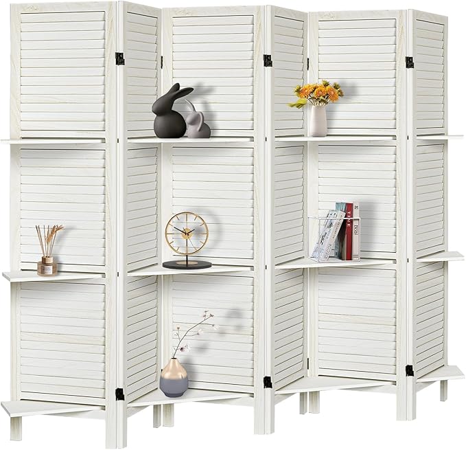 Room Divider with Shelves, Privacy Screen, Room Dividers and Folding Privacy Screens, 6 Panel Wood Temporary Wall Partition Separation Separator, White