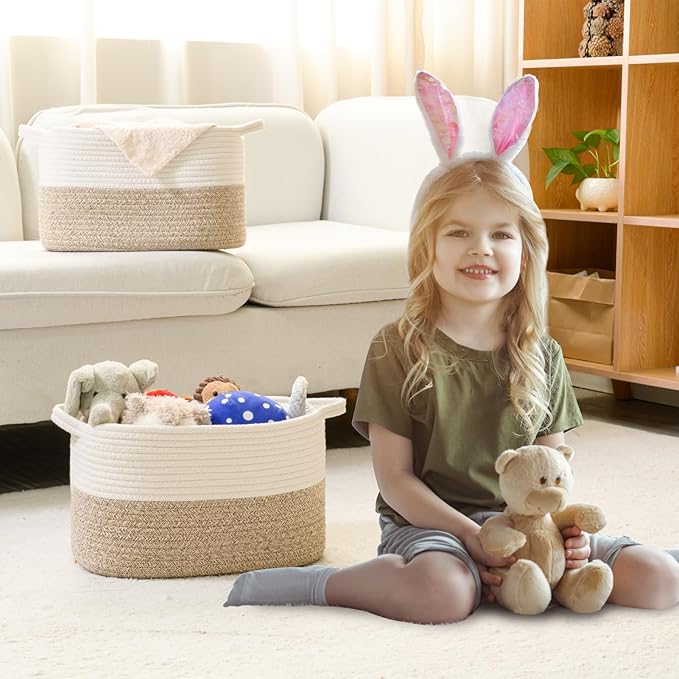 - 【Applicable】The woven basket can store children's products,such as children's toys,baby diapers,baby clothes,baby laundry basket,snacks,books,blankets,towels,and other baby products.It is the perfect storage basket for living rooms,bedrooms,bathrooms,baby rooms,miscellaneous rooms,playrooms,daycare centers,classrooms,offices,warehouses,and storage rooms.The rope basket can also be used as a basket for home storage, organizing clothes and shelves,making your room cleaner and tidier.