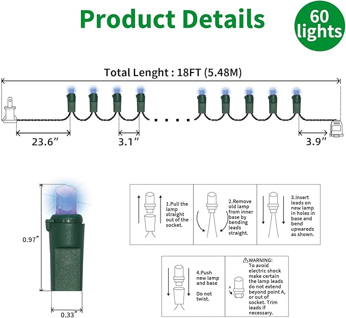 - 5mm LED Christmas Lights: 60 counts Blue 5mm wide angle stable LED string lights spaced 3.1 inches apart with green wire. 23.6 inch leads have a stackable male plug and 3.9 inch tails have a female plug for easy end to end connection.