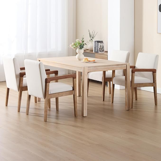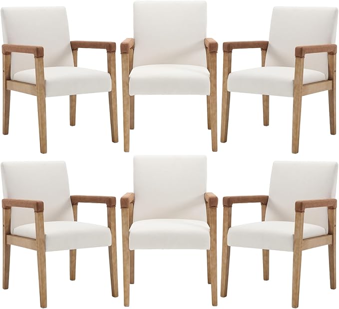 Mid Century Modern Dining Chairs Set of 6 Linen Fabric Upholstered Living Room Side Chair, Kitchen Arm Chair with Solid Wood Legs for Home Kitchen & Restaurant, Linen White