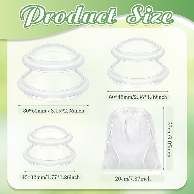 - Varied Sizes and Multipurpose Use: this silicone cups come in a variety of sizes to suitably match your needs; Large cups measure 3.15 x 2.36 inches, medium 2.36 x 1.89 inches, and small 1.77 x 1.26 inches; Whether your aching body needs to relieve pain on your shoulders, back, waist, arms, or legs, this massage cupping set has got you covered; Made of durable material and featuring a clear color, our products are designed for a wide range of applications