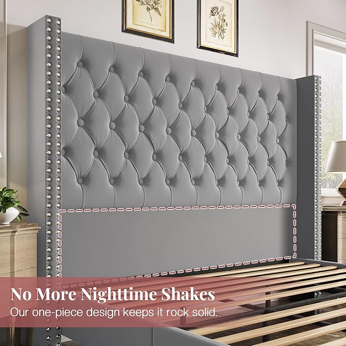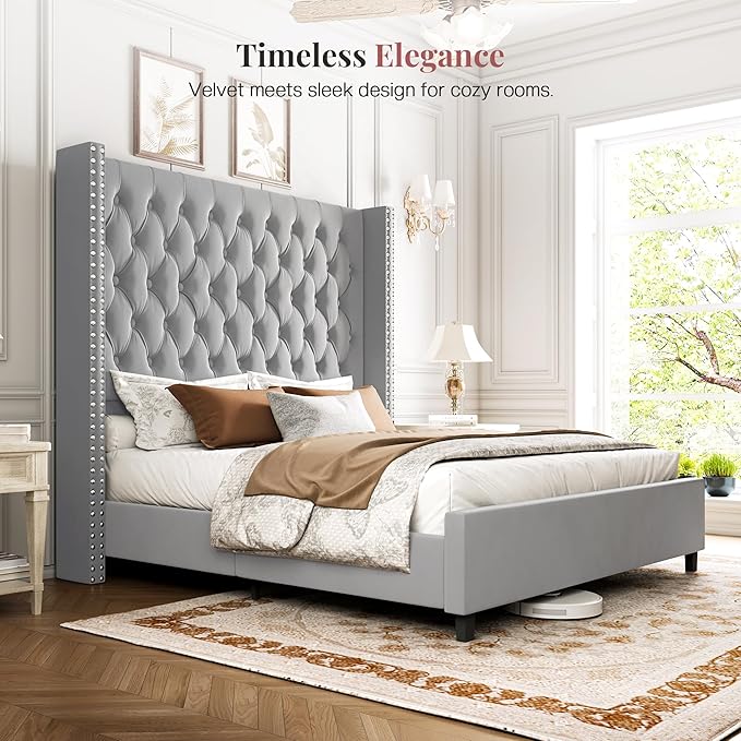 PaPaJet King Size Bed Frame with 61.4" Tall Headboard, Velvet Upholstered Platform and Handmade Deep Button Tufting, No Box Spring Required, Grey