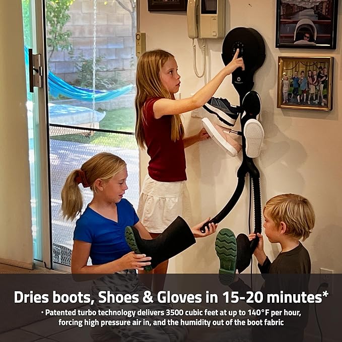 - Dries in minutes with patented technology - The Hedgehogs fan technology shoe dryer is essential for active families. It dries shoes and boots in 15-30 minutes for normal wetness, and up to 60 minutes for soaked footwear. This electric dryer is up to 20 times faster than those needing overnight drying, keeping your kids' shoes or snowboard boots ready for their next adventure.