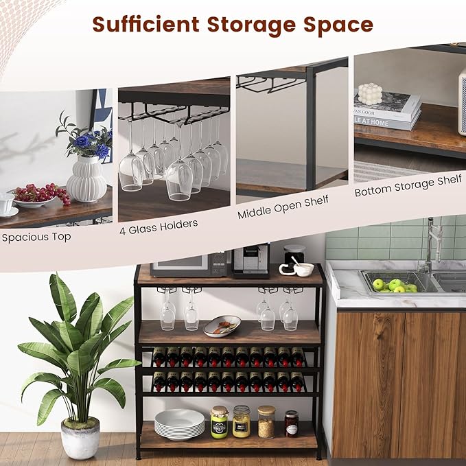 - Ample Storage Space: This wine bar cabinet features 2-tier wine bottle rack and 4 rows wine glass rack, which holds up to 20 glasses and accommodates 22 wine bottles. And the practical countertop and 2 open shelves provide additional storage space.