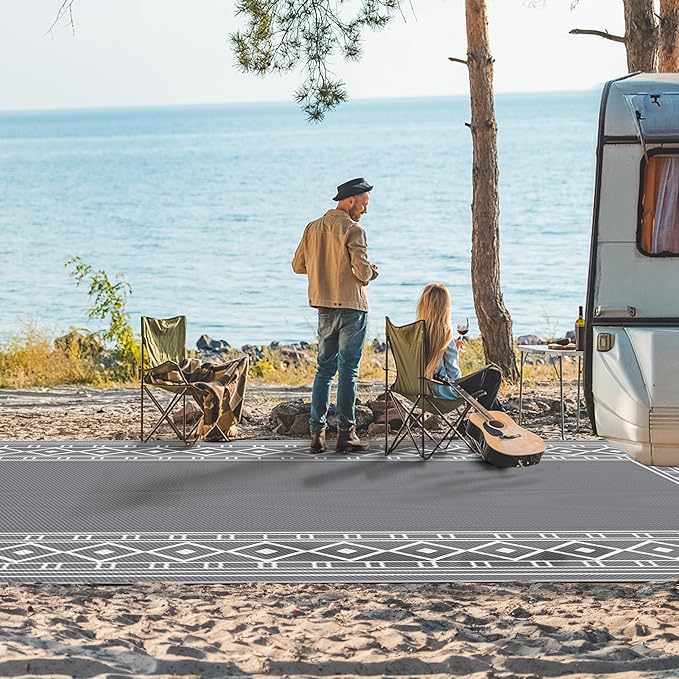 GENIMO Outdoor Rug Waterproof Area 10'x14' for Patio, Foldable Reversible Plastic Straw Carpet for Travel Trailers, Outside Mat for Rv, Deck, Picnic, Porch, Camper, Balcony, Beach, Grey & White