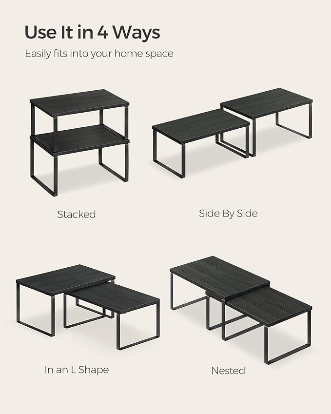 - [Adjustable] With their unique design, with one slightly smaller than the other, these shelf organizers can be stacked on top of one another, nested, used separately, or even in an L-shape. Adjust them how you want to perfectly fit your kitchen space