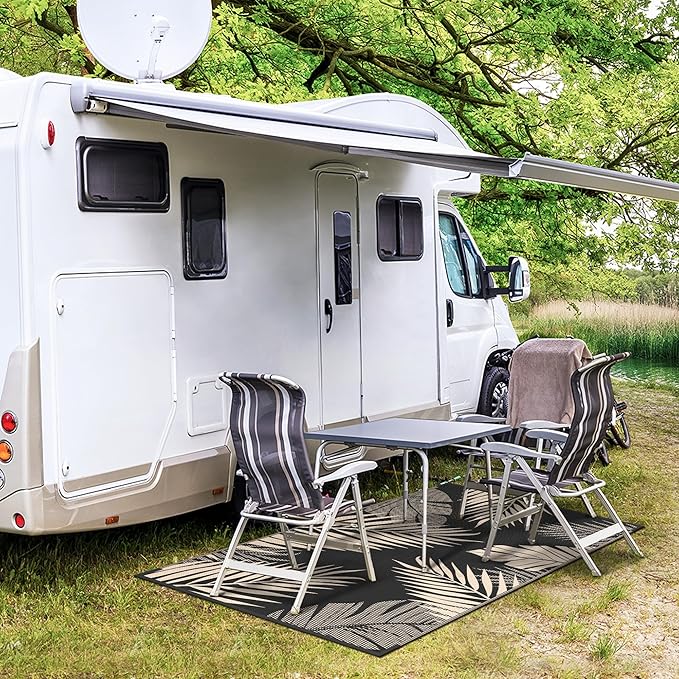 - Perfect Choice For RV Camping: Woven from lightweight plastic straws, these RV outdoor rugs fold compactly to fit in the included carry bag. This portable waterproof outdoor rug is easy to carry, with 4 corner loops and stakes to secure it. Using this camper rug reduces travel fatigue and adds plenty of space for fun — also a stylish touch for fall decor when setting up your campsite