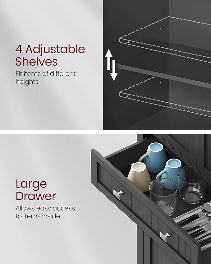 - [Huge Storage Capacity] Boasting 2 large cabinets, a big slide-out drawer, and 6 door shelves, this spacious pantry fits everything from your food and dinnerware to kitchen appliances, tidying up wherever you set it