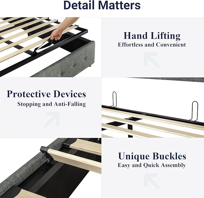 - Space-Saving Storage: With its lifting up storage feature, this bed frame provides ample space to store extra bedding, clothing, shoes, and other items, especially helpful for smaller bedrooms or apartments where storage space is limited