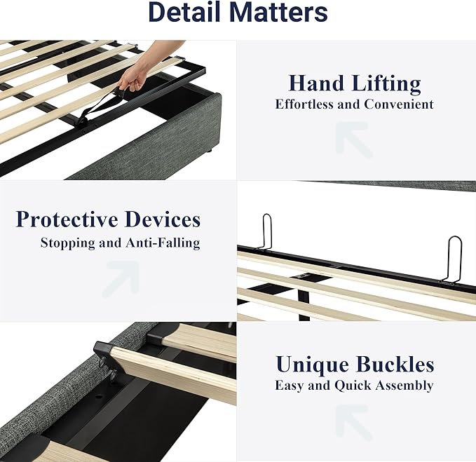 - Space-Saving Storage: With its lifting up storage feature, this bed frame provides ample space to store extra bedding, clothing, shoes, and other items, especially helpful for smaller bedrooms or apartments where storage space is limited