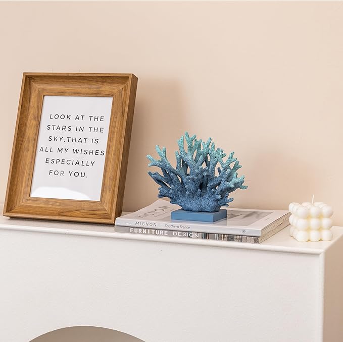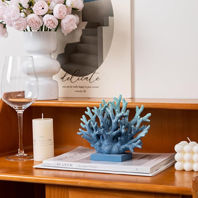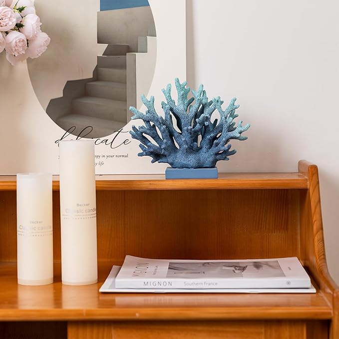 5.8" H Blue Coral Decor, Resin Coral Statue, Nautical Decorations for Home, Beach/Coastal/Ocean Themed Cabinet Shelf Tabletop Decor
