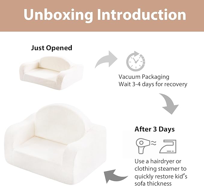 - Tips: When receiving the children's sofa, it may be wrinkled due to extrusion during transportation, and it needs to be gently patted until fluffy, and then wait for 4-5 days to naturally restore its original shape, or it can be quickly restored to its thickness with hot air blowing by clothing steam engine or hair dryer to remove wrinkles.