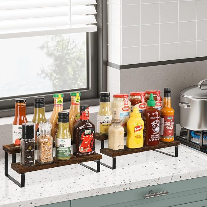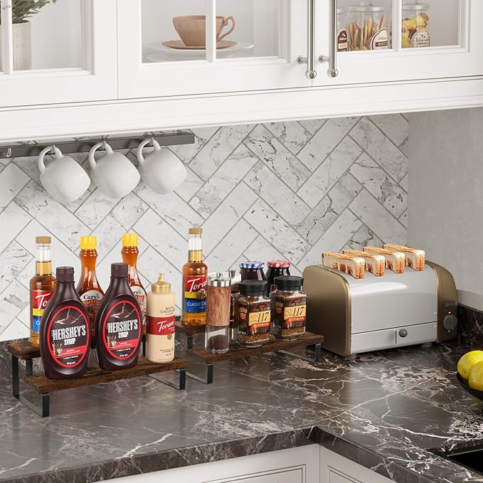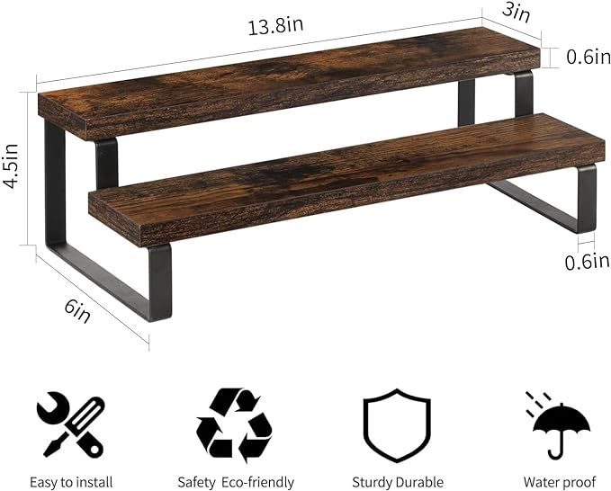 - Quick Setup & Easy Cleaning: You can have this 2-tier display riser stand assembled in 10 minutes with detailed instructions and tools. The wooden surface is waterproof and dust-free, a damp cloth could keep the counter shelf clean. (Assembly tools and accessories are included in the package)