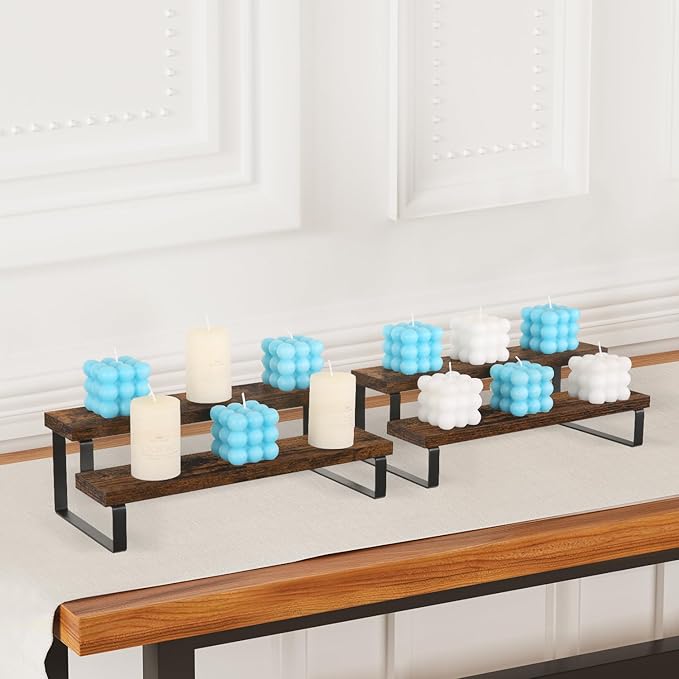 YINMIT Wooden Display Riser Stand, Tiered Perfume and Cologne Organizer Stand, 2 Tier Spice Rack Organizer, Rustic Display Shelf for Candles (2 Tier, 2 Pack)