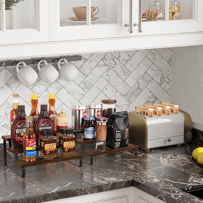 - Quick Setup & Easy Cleaning: You can have this 3-tier display riser stand assembled in 10 minutes with detailed instructions and tools. The wooden surface is waterproof and dust-free, a damp cloth could keep the counter shelf clean. (Assembly tools and accessories are included in the package)