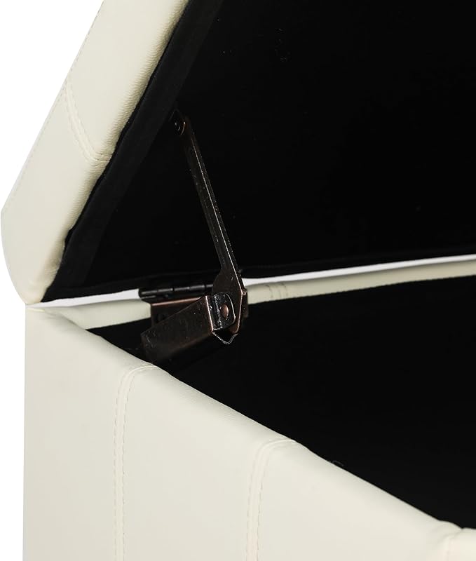 Adeco Faux Leather Storage Ottoman with Hinged Lid, 17.5 Inch High Cream White Square Cube Foot Stool with Storage, Upholstered Vanity Stool with Solid Wood Legs for Living Room, Bedroom, Dorm