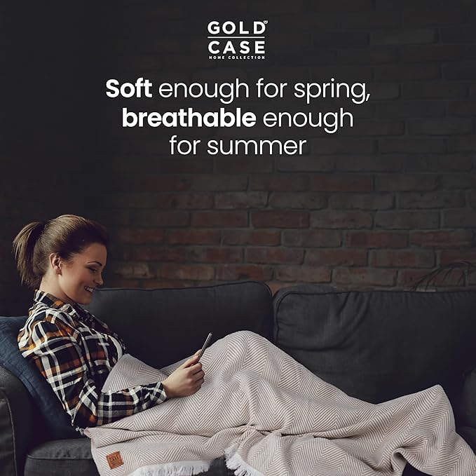 Gold Case Throw Blanket for Bed – 100% Recycled Turkish Cotton Bed Blanket – Decorative Throw Cotton Blankets for Living Room & Bedroom – Woven Twin Blankets - 71x90 - Elegant Beige