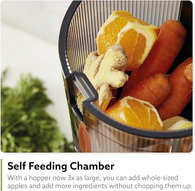 - FAMILY SIZE: Designed with a high volume self-feeding hopper that fits whole produce, and a larger opening and inlet to add more ingredients even while the juice maker is still running. It’s the perfect choice for families and committed juicers.
