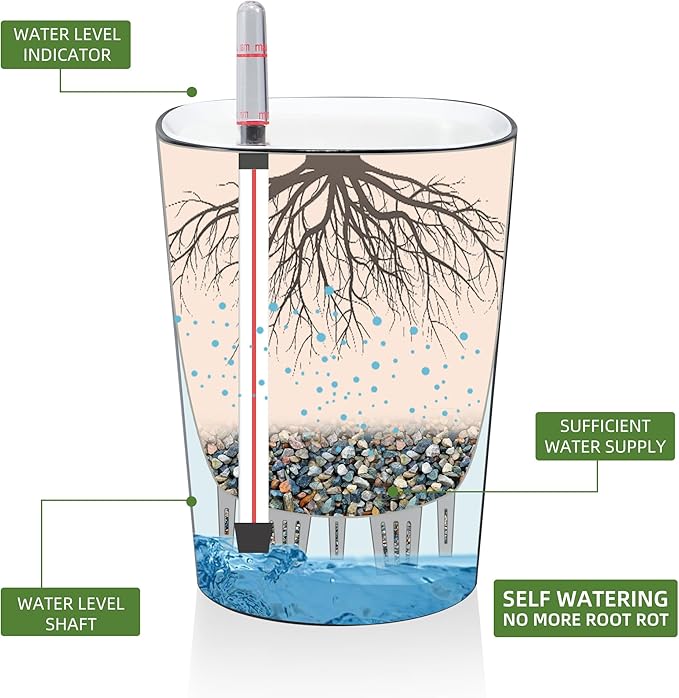 - SELF WATERING & NO MORE ROOT ROT - The smart unique sub-irrigation system is one of the most appealing aspects among all Dexceder planters. The easy-to-use separated integrated water reservoir or catcher- keeps your soil well aerated and automatic supplies plants with the right amount of ongoing moist air & nutrition for optimal growth. The insert indicator shows you the exact time to water again. The full water supply period can single-handedly last over 3 weeks based on different live plants