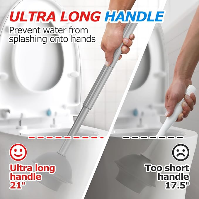 - ♦Extended handle -Heavy Duty Toilet Plunger: Compared to ordinary handles, our upgraded extended handle provides a better user experience and prevents stains from splashing onto the hands.A professional powerful suction cup that can solve various blockage problems. Comfortable handles provide greater support during use.