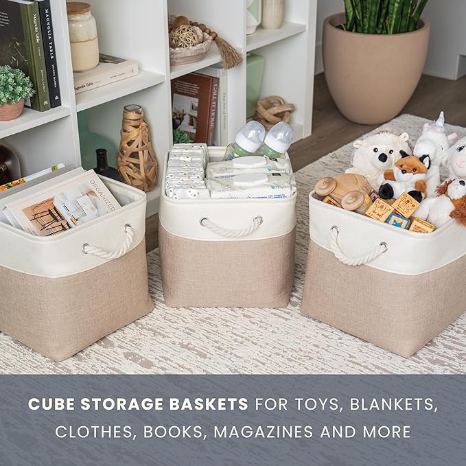- Decorative Fabric and Rope Handle - These versatile 11 x 11 storage cubes baskets for organizing your everyday life are made with a thick, high-quality fabric and fitted with rope handles to add a stylish touch to a living room, bedroom, office, or personal space.