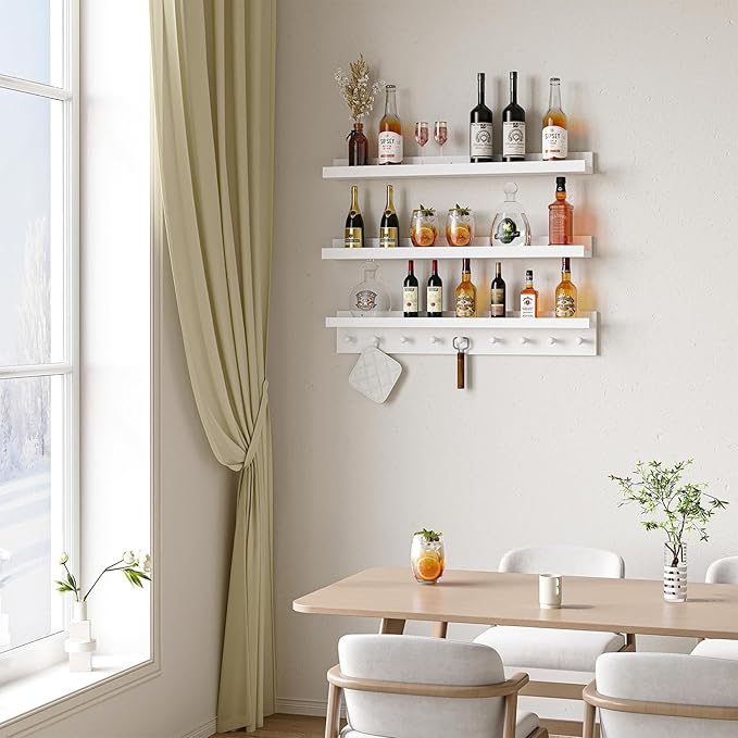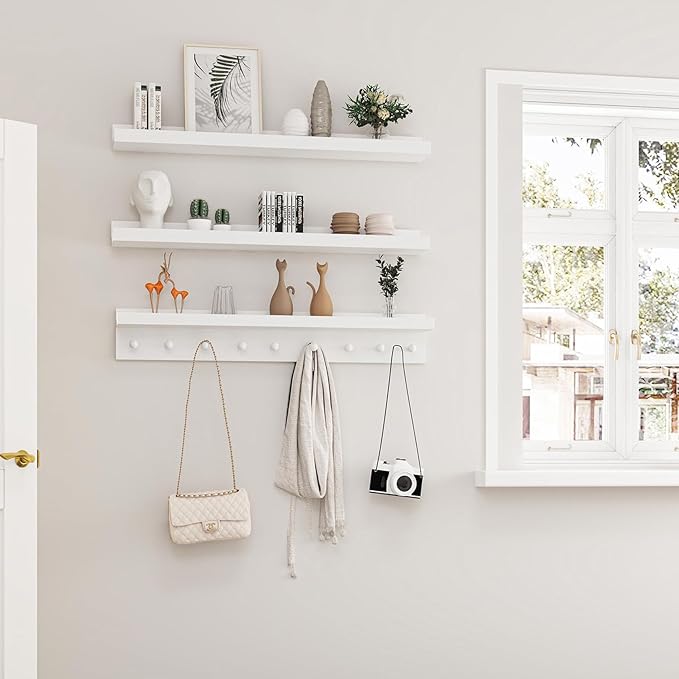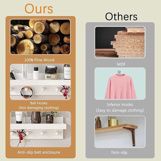 - 100% Pine Wood: Floating shelves with white hooks are crafted from quality wood to ensure excellent durability. Solid wood floating shelves are carefully selected to guarantee a beautiful appearance while withstanding weight and pressure, and large floating shelf with lip provide more storage space.