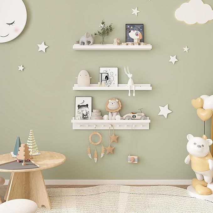 - Multi-Functional: Floating picture shelf serve many purposes, allowing you to showcase and store items such as small plants, decorations, books, and more. The nursery bookshelf provides stable support for items while adding to the decorative effect. Wall mounted shelves can be used as an accessory to hang lightweight items like keys, ornaments, and more, further enhancing the practicality of the trough.