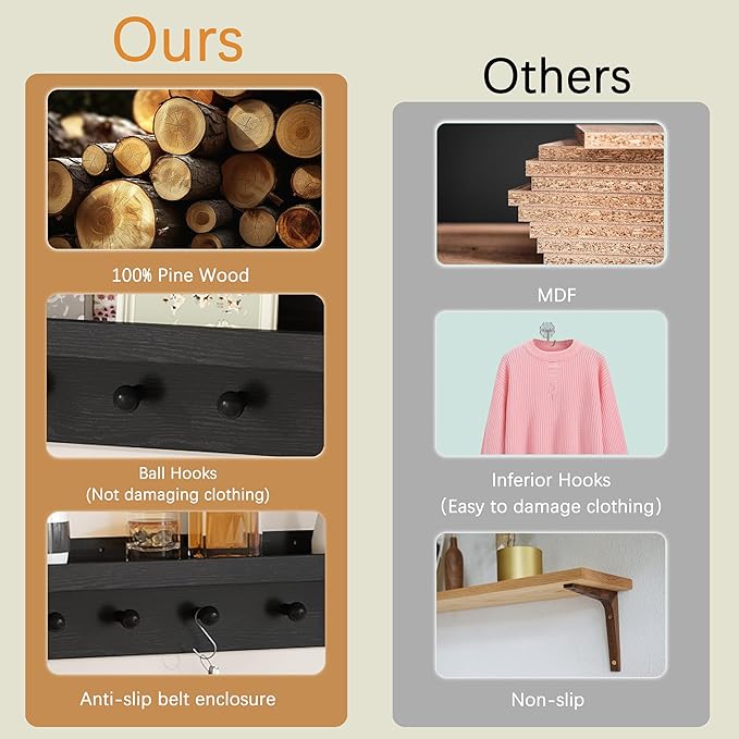 - 100% Pine Wood Craftsmanship: Meticulously fashioned from premium pine wood, the floating shelves and the wooden picture ledge with hooks guarantee exceptional durability. The selection of construction materials has undergone meticulous scrutiny, ensuring an appealing aesthetic while enduring weight and pressure, creating a dependable and steadfast user experience.