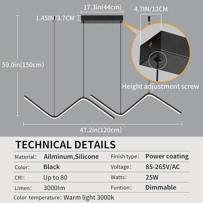 - Specification Parameters :Material:aluminum and acrylic, Power: 25W, Voltage: 85-265V/AC, Length: 120cm, Height:150cm, Base length:50CM. Suspension wire can be adjusted to the right height.