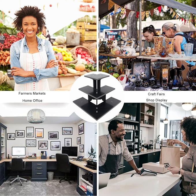 - EASY TO ASSEMBLE: Our portable display rack shelves are precision cut pieces specifically engineered to snap together. It installs quickly without any hardware or tools, and can be assembled/disassembled repeatedly, making it easy to take to farmers markets, craft shows, and trade shows. Our carefully crafted stands make products shine, this black risers display stands size: 13"L x 13"W x 9.5"H.