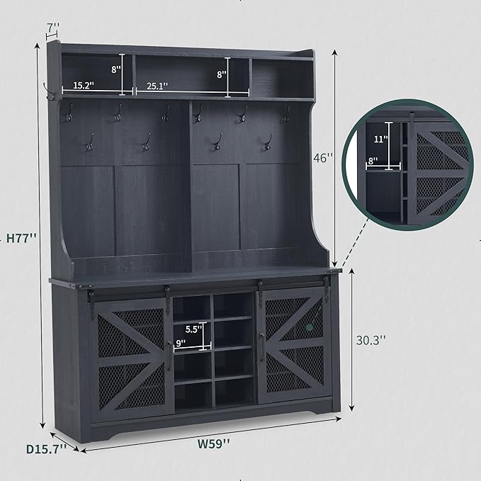 JXQTLINGMU 59" Farmhouse Hall Tree with Shoe Storage, Entryway Bench with 20 Cubbies, 12 Hooks & Sliding Barn Doors, Mudroom Coat Rack Cabinet, Black