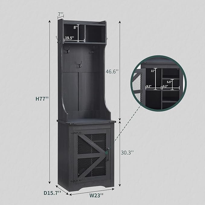 JXQTLINGMU 23" Farmhouse Hall Tree with Shoe Storage, Entryway Bench with 6 Cubbies, 5 Hooks & Barn Doors, Mudroom Coat Rack Cabinet, Black