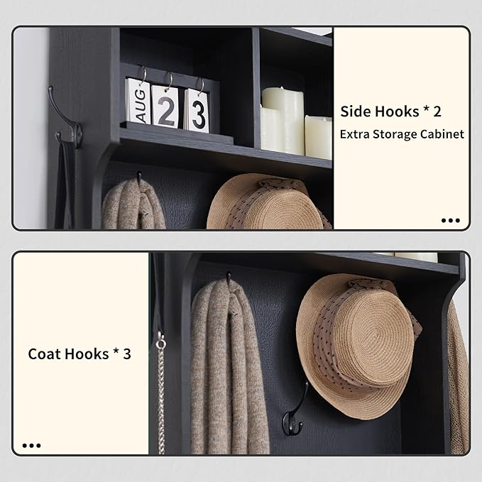 - Ample Storage Capacity: Featuring 6 shoe cubbies, 5 double coat hooks, and 2 overhead compartments, plus a spacious bench top for sitting or displaying decor. Keep your coats, hats, shoes, and other essentials neatly stored and easily accessible, while maintaining a clutter-free entryway.
