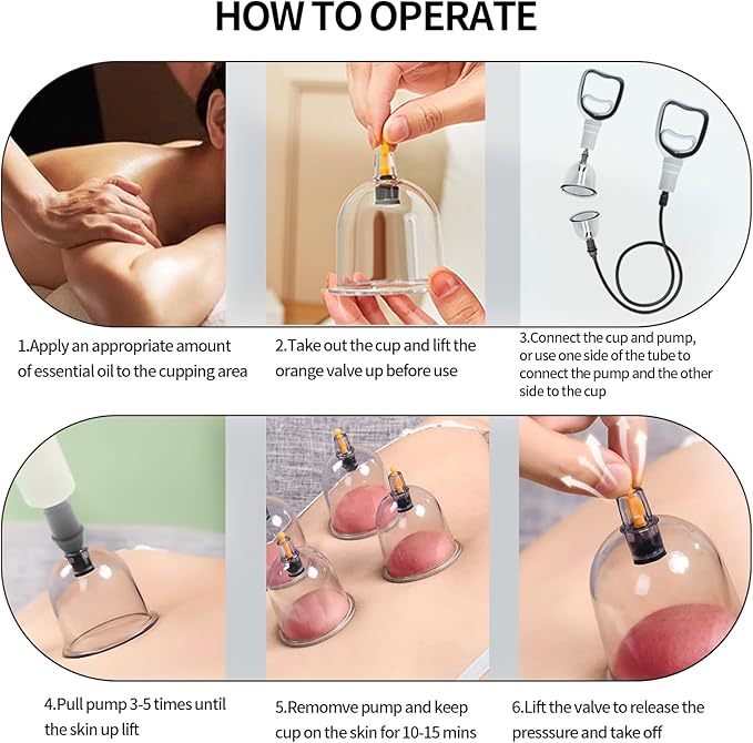- 【 Important Note 】 Thoroughly clean skin and remove body hair before cupping. Excessive body hair will result in weak suction. Do not take a bath or swim for 8 hours after cupping and keep warm. For any questions about this item, please feel free to contact us.