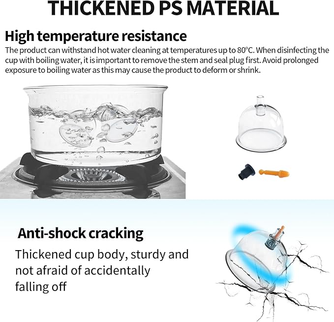 - 【 Premium Thickened Material 】Unlike other cheap cupping device on the market, this cupping set massage therapy cups are made of stronger thickened PS Material, due to the extremely high heat resistance and toughness of PS material, our cupping cups can be sterilized with boiling water and will not break even if dropped from a height, and have a longer service life. The widened edge of the cup mouth has a larger contact area with the skin, providing better air tightness and comfort.