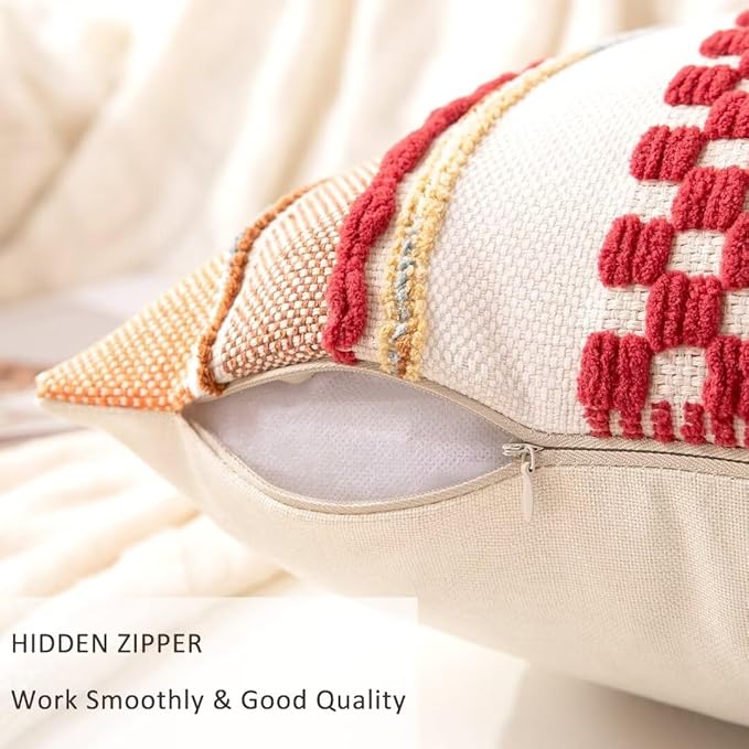 - Fabric: The red stripe pillow case is made up of chenille and tufted on the front, and premium linen fabric on the back. Different styles on both sides offer you multiple decorative ideas. Sturdy stitching and careful hemming make the red chenille pillow covers durable and exquisite. The zipper pulls up smoothly and is not easy to break