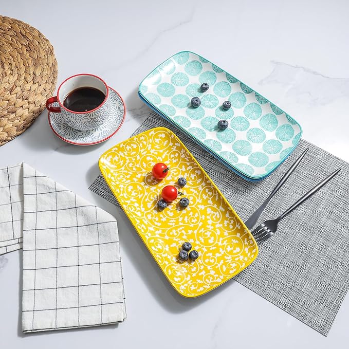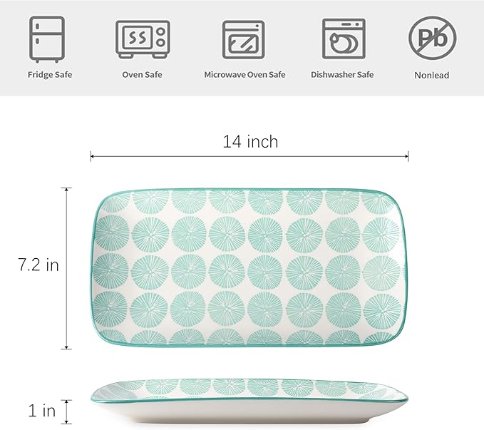 - STURDY & EASY CLEANUP - Fired at a high temperature with a good thickness to ensure their sturdiness and has no harmful Lead & Cadmium that make them healthier. The smooth surface protects its vibrant color forever and allows the large platter to be cleaned effortlessly. Safely used in the Microwave, Oven, Fridge, and Dishwasher.