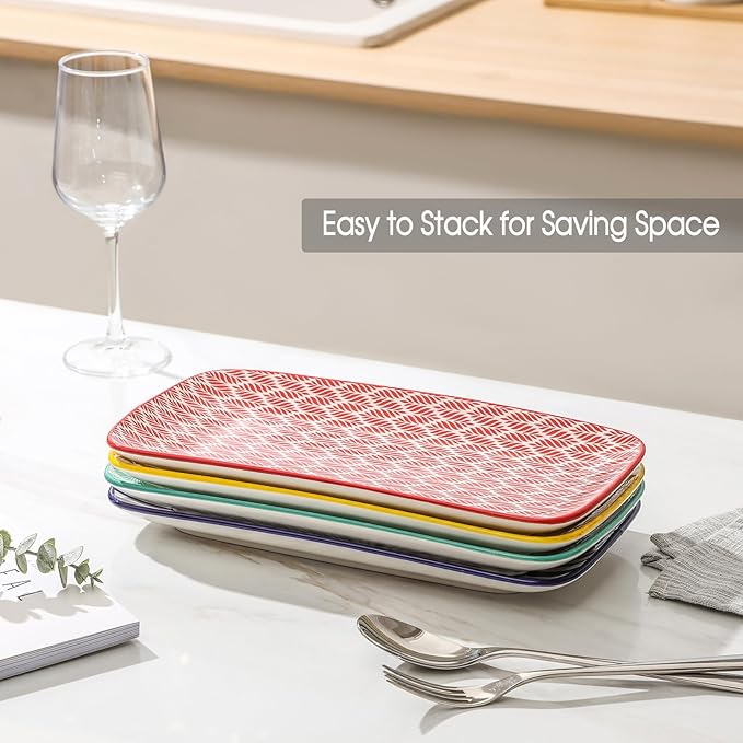 - STACKABLE & EASY TO HOLD - The rectangular shape design of this serving plate makes it stackable neatly and stable to convenient for storage. The upward curved edges around the plate can prevent food from falling out to keep the table tidy and easy to hold.