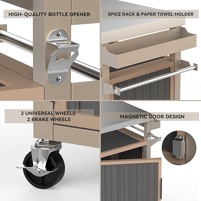 - Practical Accessories: The outdoor kitchen cart comes with several handy features that includes a spice rack, a paper towel holder, and a bottle opener, which keeps your essentials within reach.