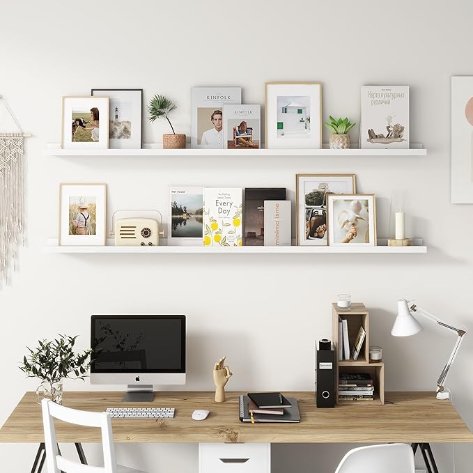 Picture Ledge Shelf, Floating Shelves Set of 2, Solid Pine Wood 72'' Long Large Nursery Book Shelves for Toys Storage, Kids Bookshelf for Living Room Bedroom Decor Books Photo Frames, White
