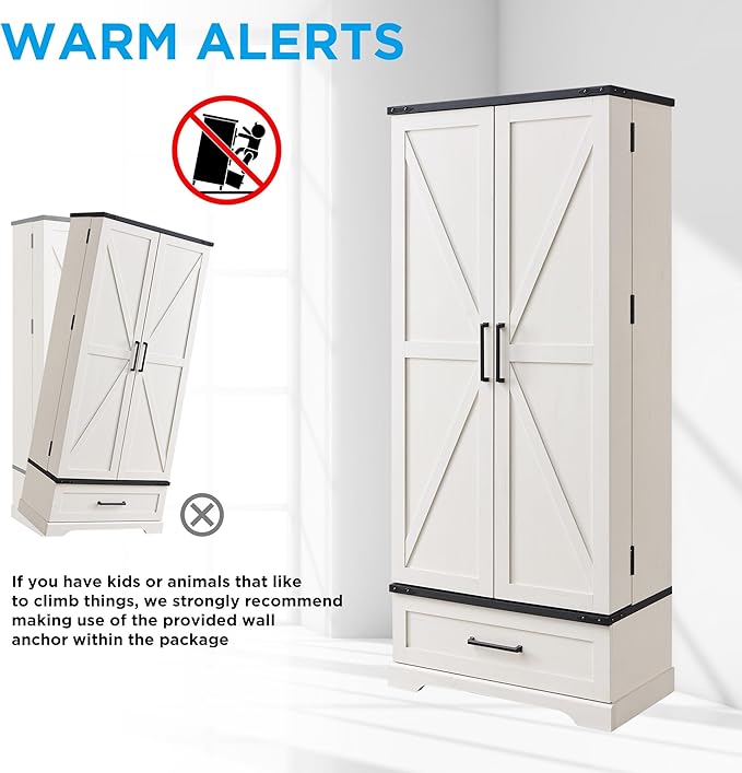 - BUILT FOR LAST. Crafted from quality MDF and reinforced with three hinges for each top cabinet door, our pantry cabinet ensures stability and durability for long-term use. For added safety, the included anti-tip kit secures the cabinet to the wall, providing a secure living space. Elevate your storage solutions with this stable, durable, and stylish pantry cabinet.