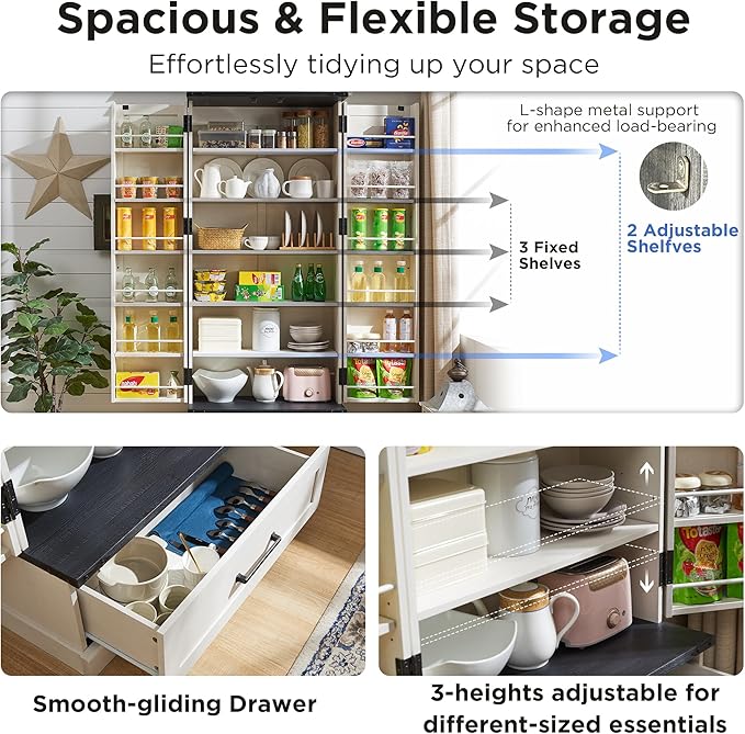 - ENJOY THE WELL-ORGANIZED STORAGE. The 12-door shelves, strategically designed with 3 different heights, maximize top cabinet space, ensuring easy access to small items like spices and olive oil. With a large cabinet, a spacious slide-out drawer, and 12 versatile door shelves, this pantry accommodates everything from food and dinnerware to kitchen appliances, effortlessly tidying up any space.