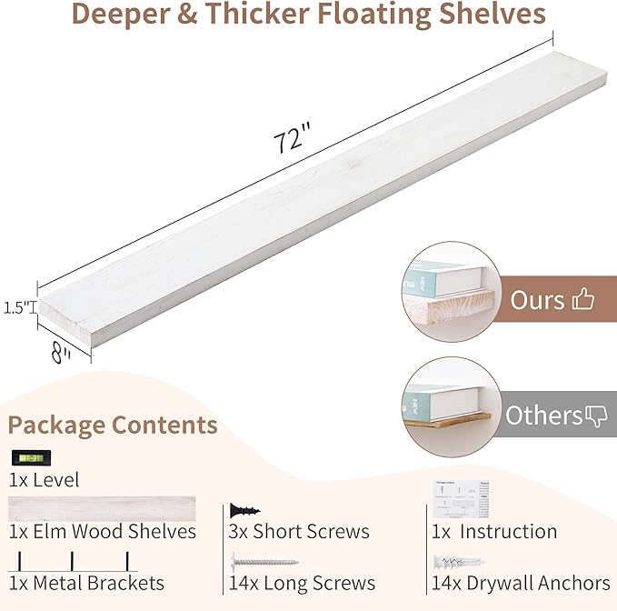 Rustic Elm Wood Floating Shelves - 72'' W x 8" D Wall Mounted Mantel Shelf with Invisible Bracket, Large Long Storage Shelves for Living Room, Bedroom, Kitchen, Bathroom, White Wash