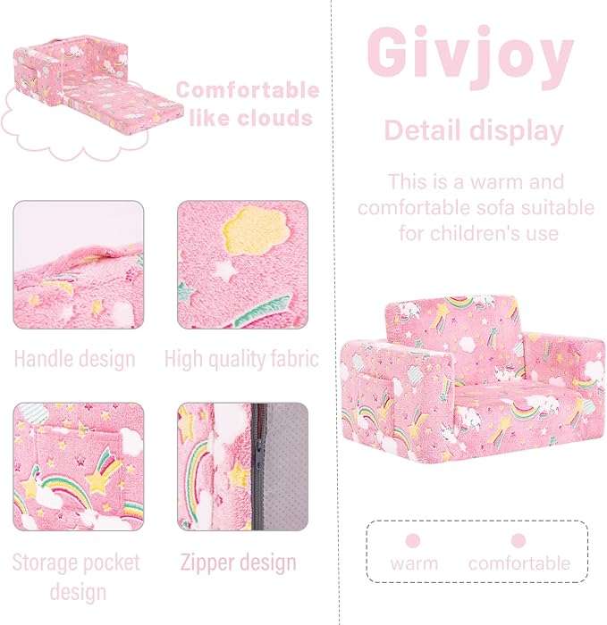 - 【Practical Pocket & Handy Handle】 Thoughtfully designed 2-in-1 kid couch sofa also has convenient pockets for kids to store their favorite story books, dolls or plush toys! Additionally, a practical handle is easy for toddlers to transport this kids fold out couch safely from room to room.
