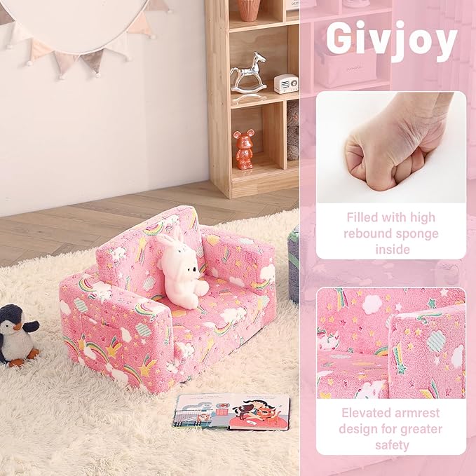 - 【Multifunctional 2-in-1 Design Unique Present for 18 months+ Boys and Girls】The 2-in-1 children's sofa couch is a wonderful present for all kids & toddlers on Birthdays, Christmas, or other occasions! Your child will find this small kids' couch a perfect spot for relaxing, reading, playing, or enjoying their favorite TV shows. Meanwhile, with both modern design and fashionable colors, this small couch can fit any room and add great vitality to your house.