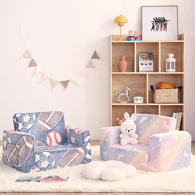 - 【Kids Sofa Requires No Assembly】The 2-in-1 toddler sofa couch is in vacuum packing. Open the Kids Couch packaging and you will get a soft plush Sofa for your kids. Please allow 4-5 days for the kids sofa couch to take on its original shape or use a clothing steamer to quickly restore its thickness and remove creases.