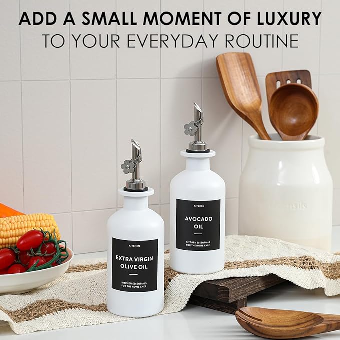 - KITCHEN ESSENTIAL - Worthy of sitting on your kitchen counter, The olive oil bottle dispenser for kitchen with label which can help you identify them easily, both decorative and practical, this oil dispenser bottles not only kitchen oil dispenser, but also black and white kitchen décor.