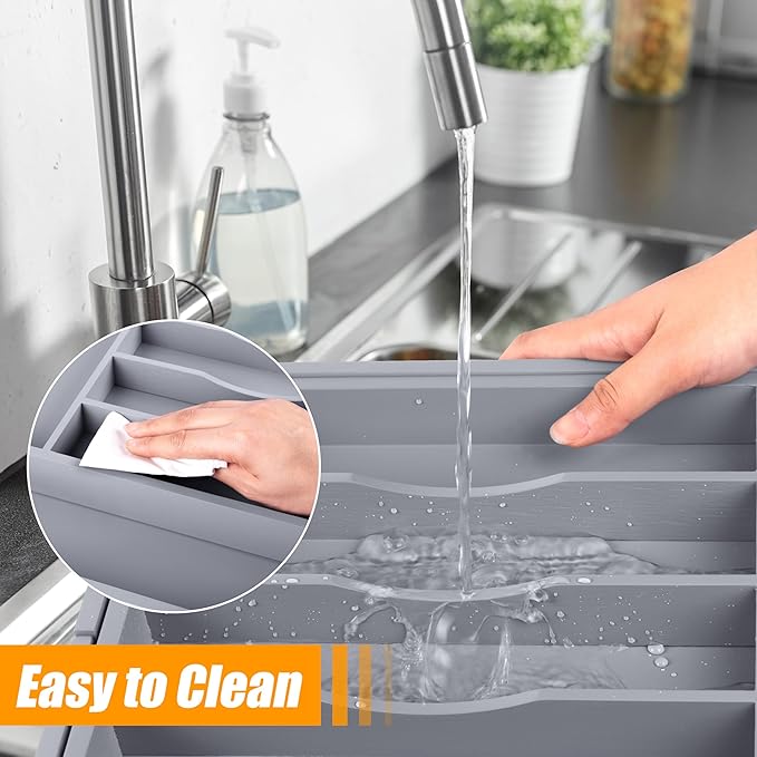 - ✅【Helper - Keep Your Home Tidy】Say goodbye to cluttered junk drawers and the hassle of searching for kitchen utensils. No more digging through drawers filled with silverware and miscellaneous items. Our utensil silverware drawer organizer can help you stay organized, providing a designated spot for each item, ensuring everything is in its place and easily accessible. Different-sized compartments accommodate standard utensils and larger dinnerware. And maintain an overall tidy and clean appearance.