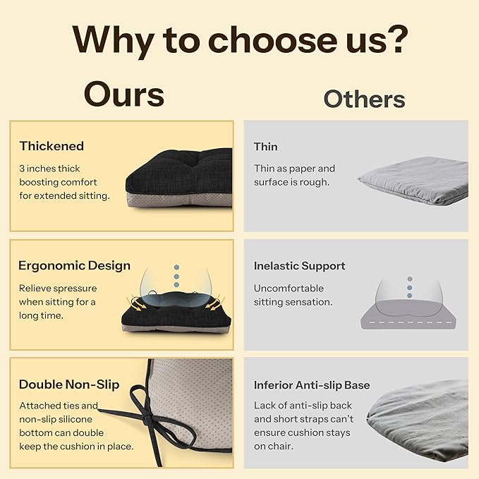 - Enhanced Support & Premium Filling: Our dining room chair cushions offer double the comfort with high quality cotton filling that offers superior comfort and support, relieving pressure on your hips and tailbone during extended seating. The chair cushions are tufted to prevent foam clumping. Perfect for extended sitting whether at the desk or dining table it combines comfort with ergonomic support.