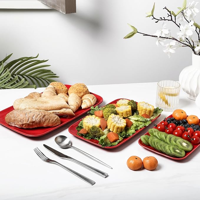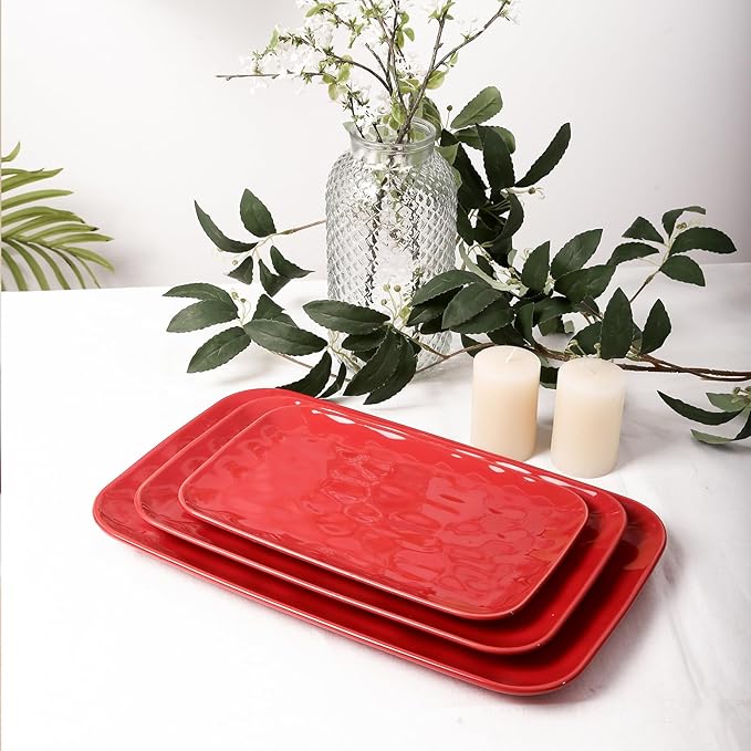 Vicrays Ceramic Rectangle Serving Platters - 14" 12" 10" Porcelain Serving Trays Plates for Party BBQ Appetizers Sushi Dessert - Microwave Oven and Dishwasher Safe - Set of 3 Red